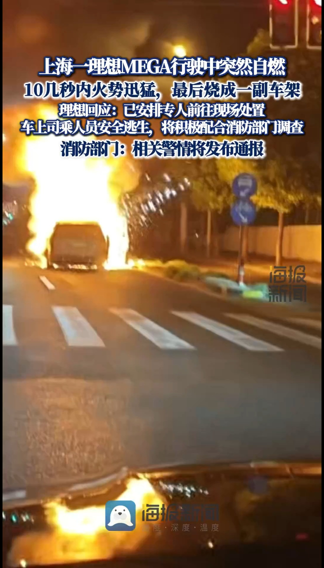 上海一理想MEGA走着走着突然起火,十秒内火势迅猛,理想回应:消防已介入调查