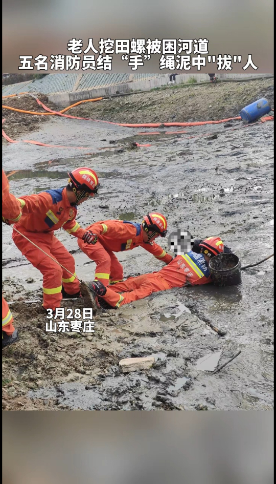 老人挖田螺被困河道 五名消防员结“手”绳泥中“拔”人
