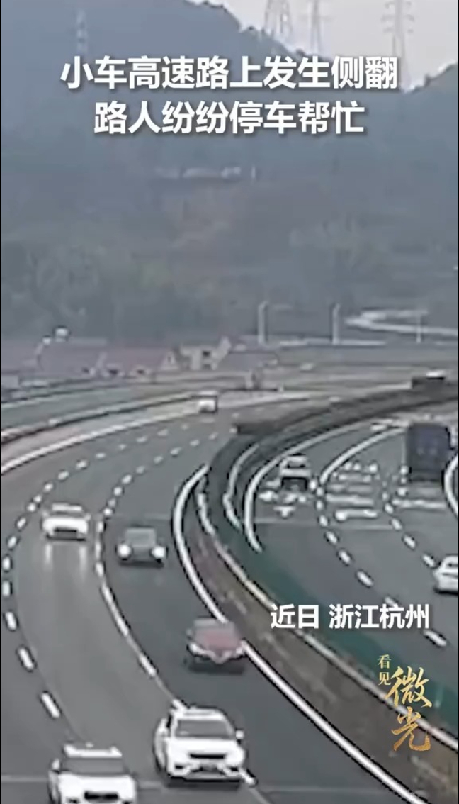 小车高速发生侧翻 接亲婚车加入救援