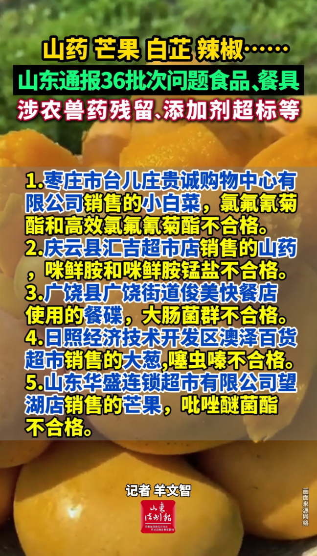 山药、芒果、白芷、辣椒……山东通报36批次问题食品及餐具,涉农兽药残留、添加剂超标等