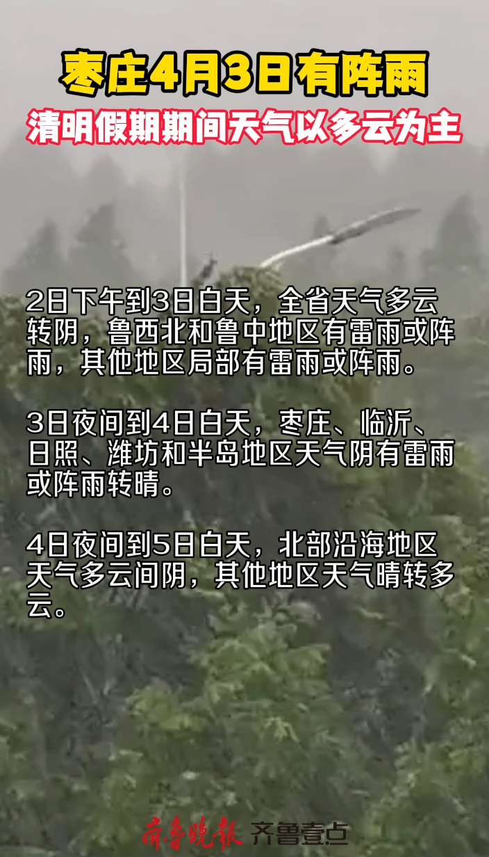 枣庄4月3日有阵雨,清明假期期间天气以多云为主