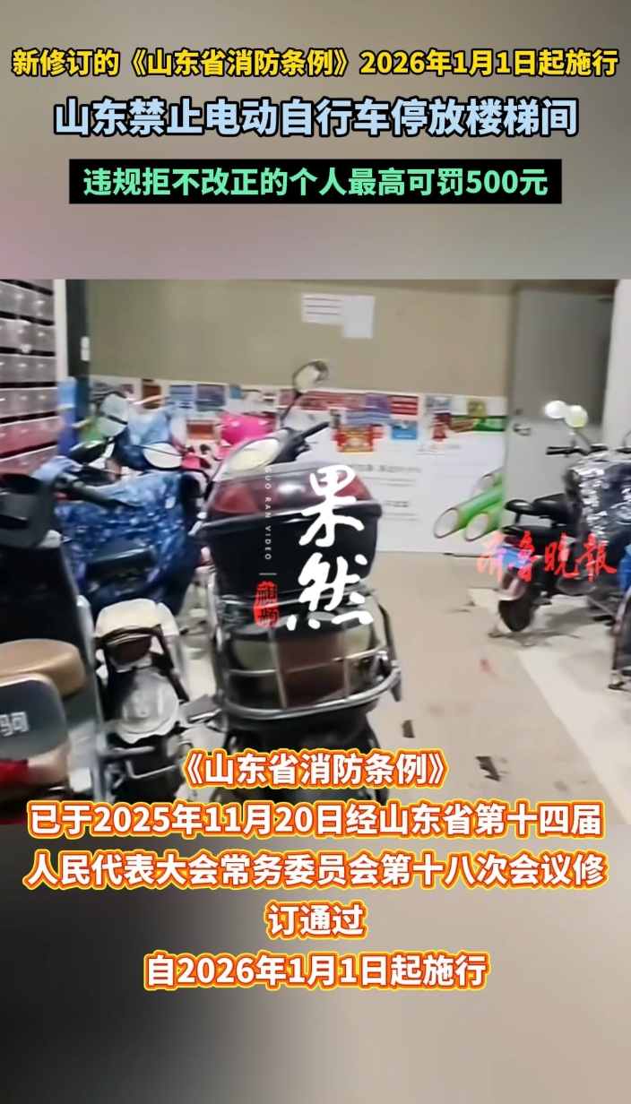 果然视频|山东修订消防条例,电动自行车停放楼梯间个人最高可罚500元