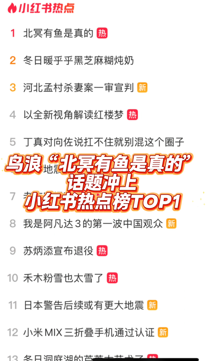鸟浪“北冥有鱼是真的”话题冲上小红书热点榜TOP1