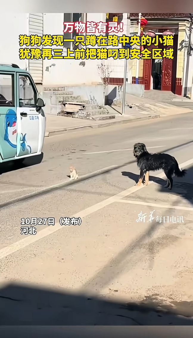 万物皆有灵!狗狗发现一只蹲在路中央的小猫