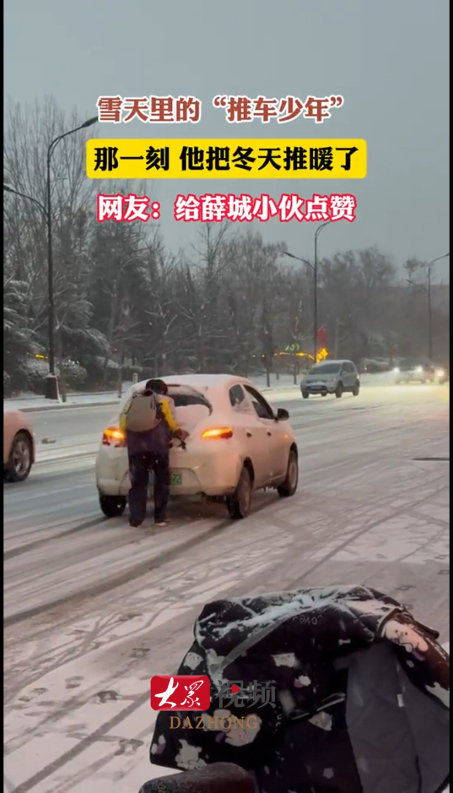 雪天里的“推车少年” 那一刻 他把冬天推暖了