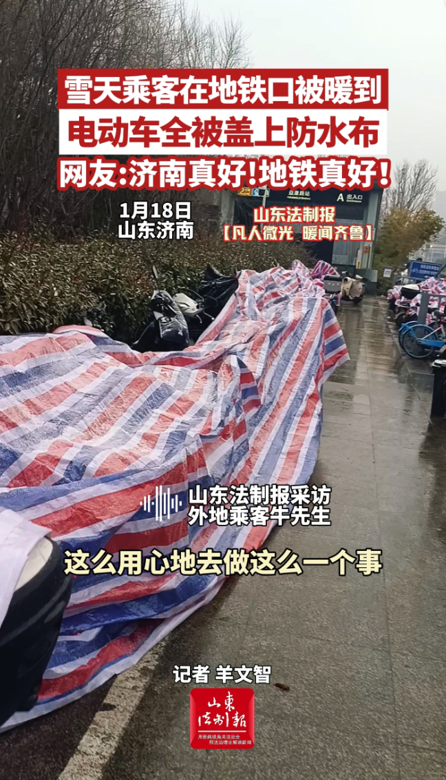 雪天乘客在地铁口被暖到,电动车全被盖上防水布,网友:济南真好!地铁真好!
