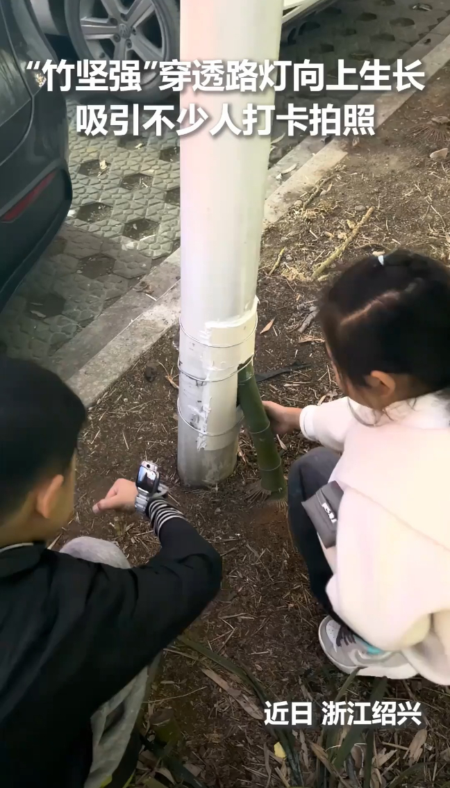 “竹坚强”穿透路灯杆向上生长,引众人打卡拍照
