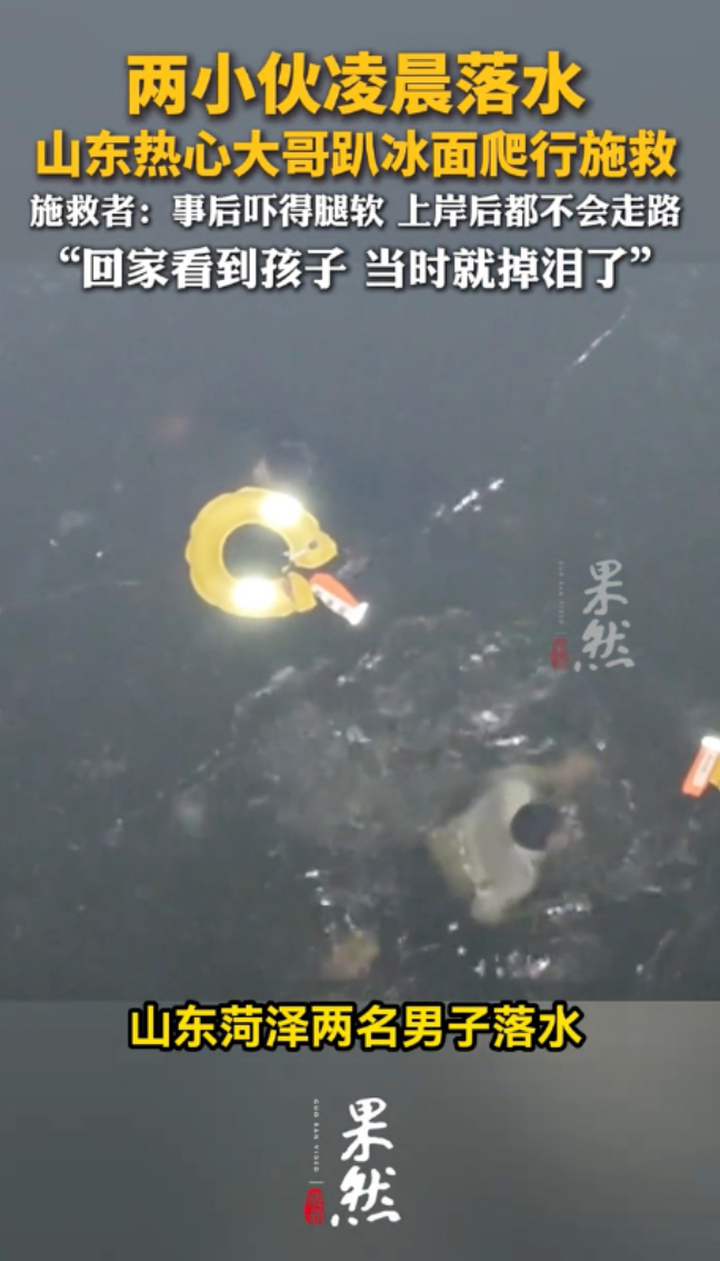 两小伙凌晨落水,山东热心大哥趴冰面爬行施救