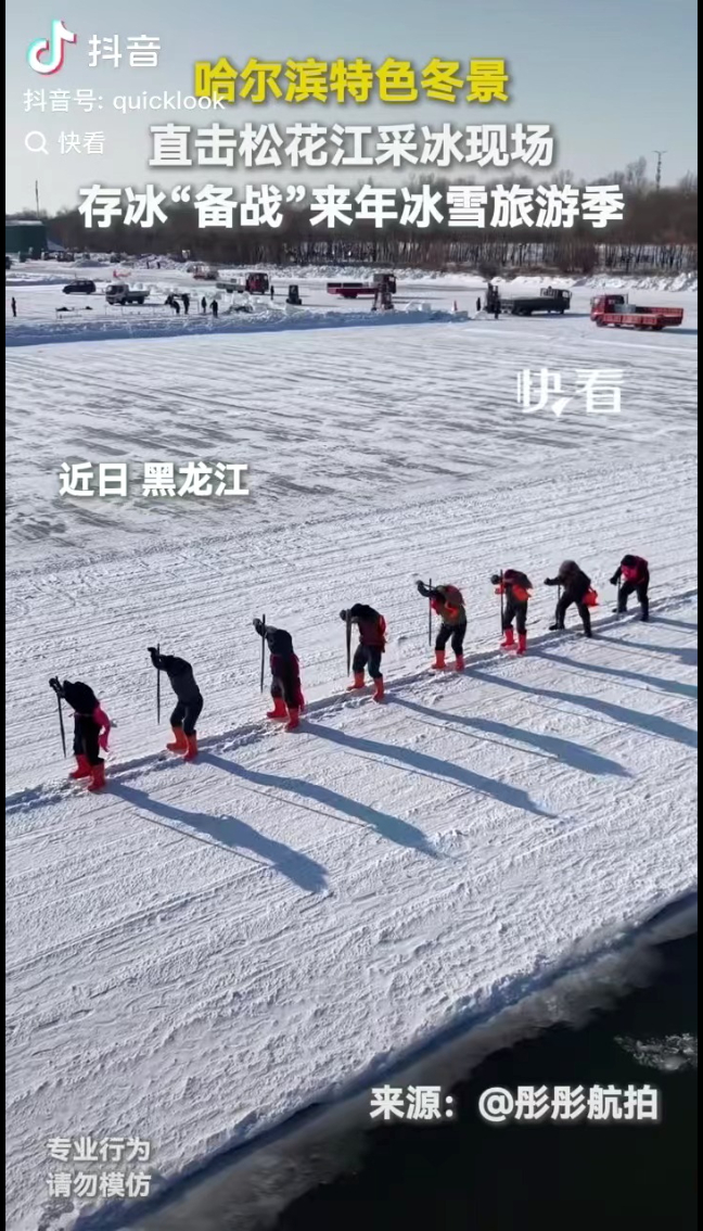 哈尔滨特色冬景,直击松花江采冰现场,存冰“备战”来年冰雪旅游季