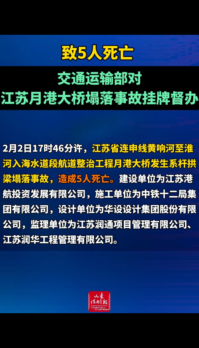 致5人死亡 交通运输部对江苏月港大桥塌落事故挂牌督办