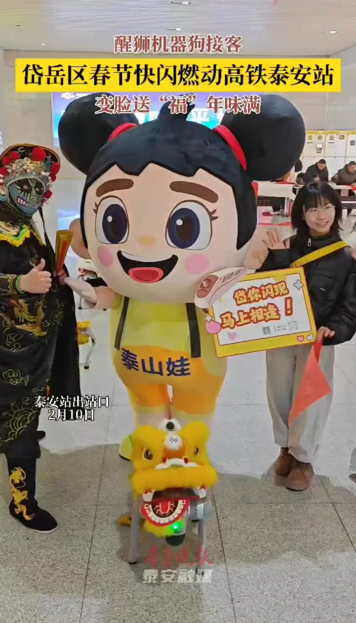 果然视频丨岱岳区春节快闪燃动高铁泰安站,醒狮机器狗接客,变脸送“福”年味满