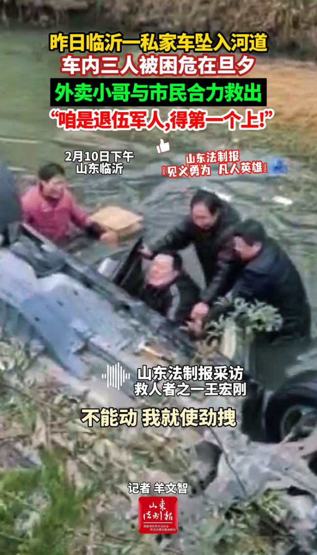 昨日临沂一私家车坠入河道,车内三人被困危在旦夕,外卖小哥与市民合力救出,“咱是退伍军人,得第一个上!”