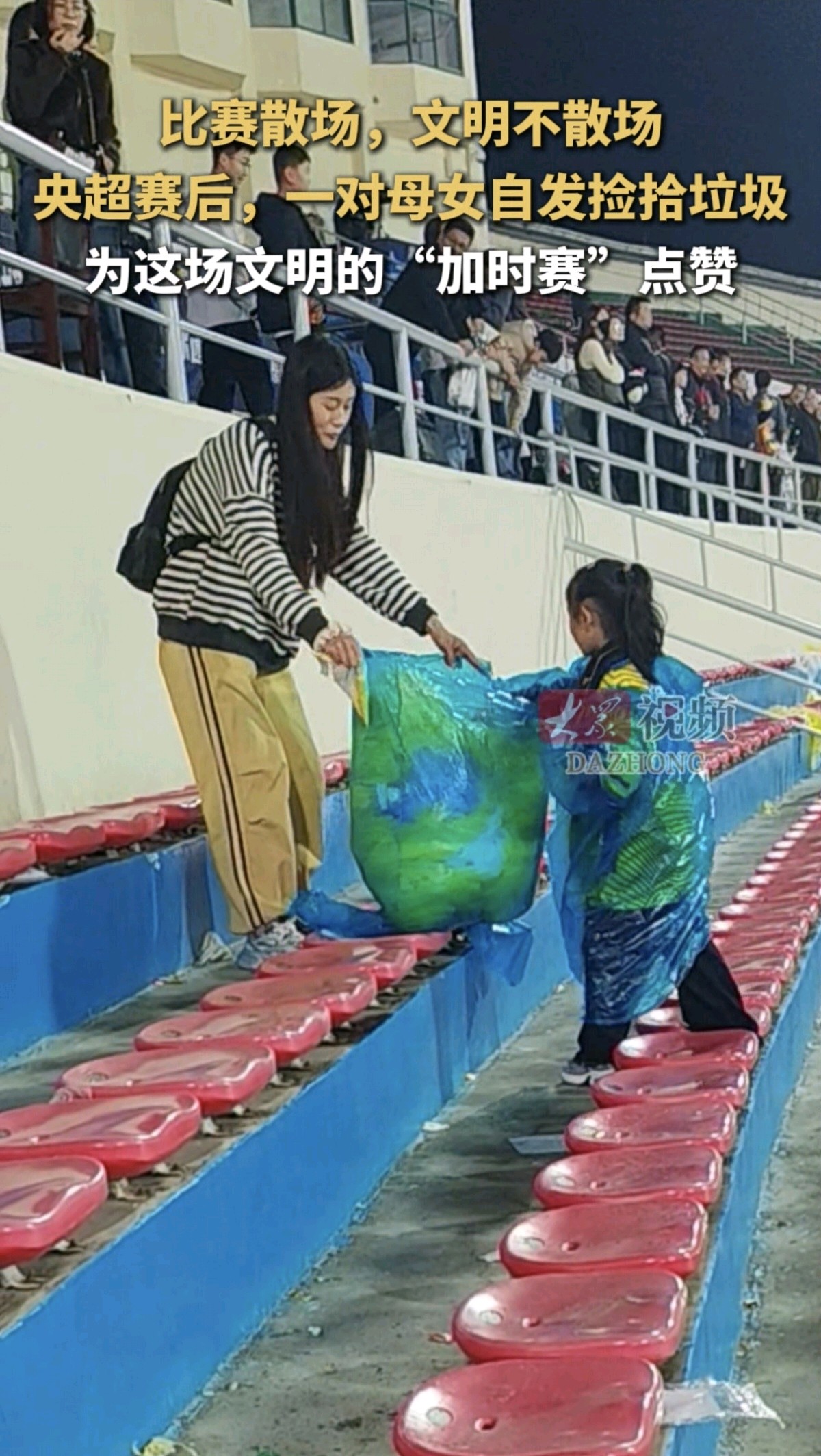 比赛散场,文明不散场 央超赛后,一对母女自发捡拾垃圾 为这场文明的“加时赛”点赞