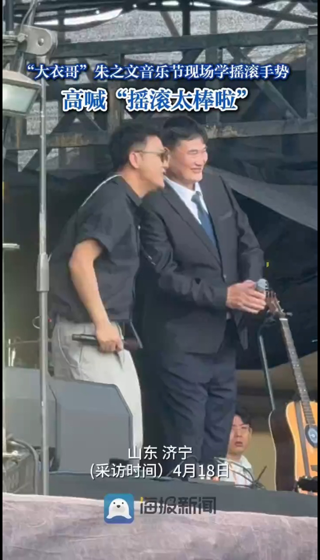 “大衣哥”朱之文音乐节现场学摇滚手势,高喊“摇滚太棒啦”