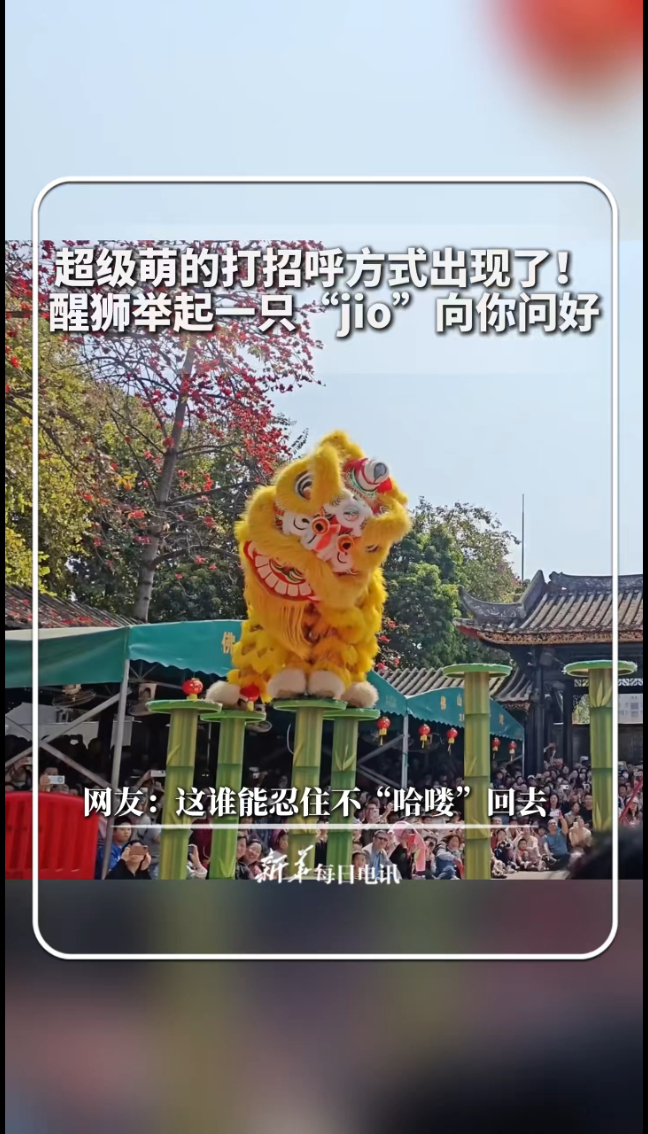 超级萌的打招呼方式出现了!醒狮举起一只“jio”向你问好