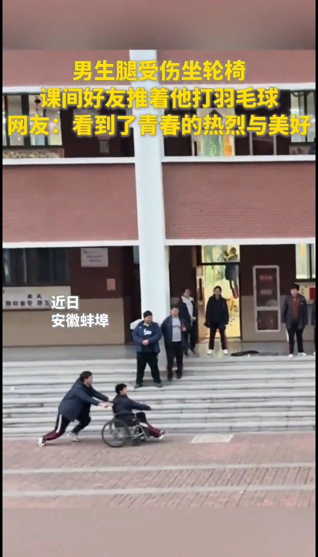 男生腿受伤坐轮椅,课间好友推着他打羽毛球