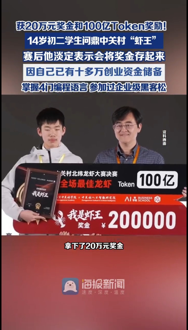 主播说 | 获20万元奖金和100亿Token奖励!14岁初二学生问鼎中关村“虾王”:赛后他淡定表示会将奖金存起来