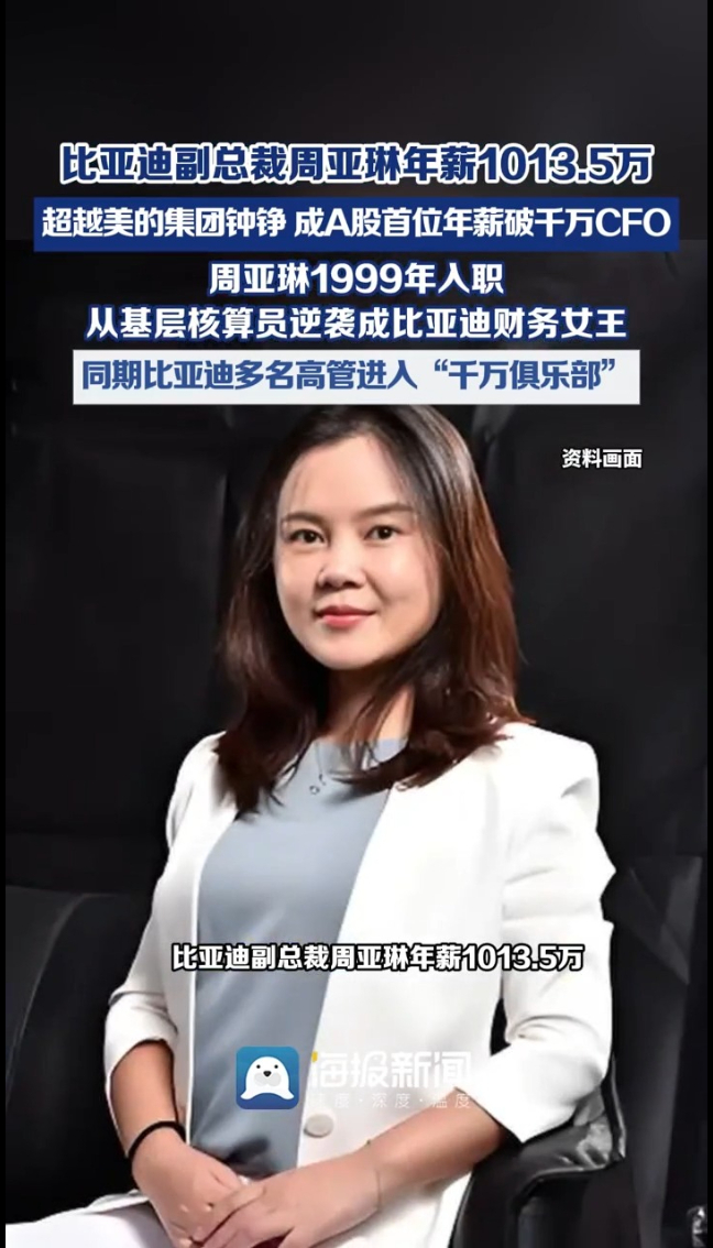 主播说丨比亚迪副总裁周亚琳年薪1013.5万 ,超越美的集团钟铮,成A股首位年薪破千万CFO