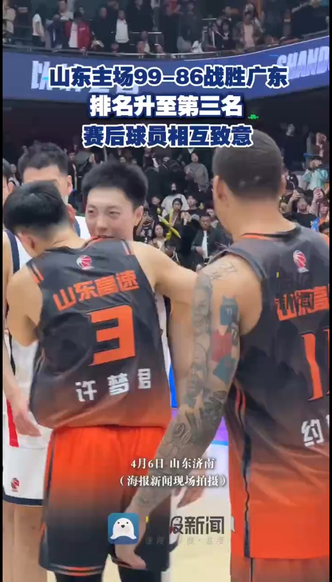 山东主场99-86战胜广东排名升至第三名,赛后球员相互致意