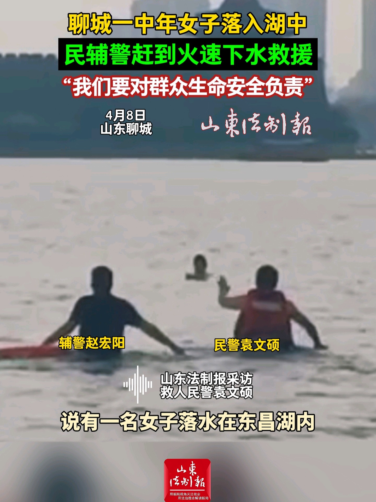 聊城一中年女子落入湖中,民辅警赶到火速下水救援,“我们要对群众生命安全负责”