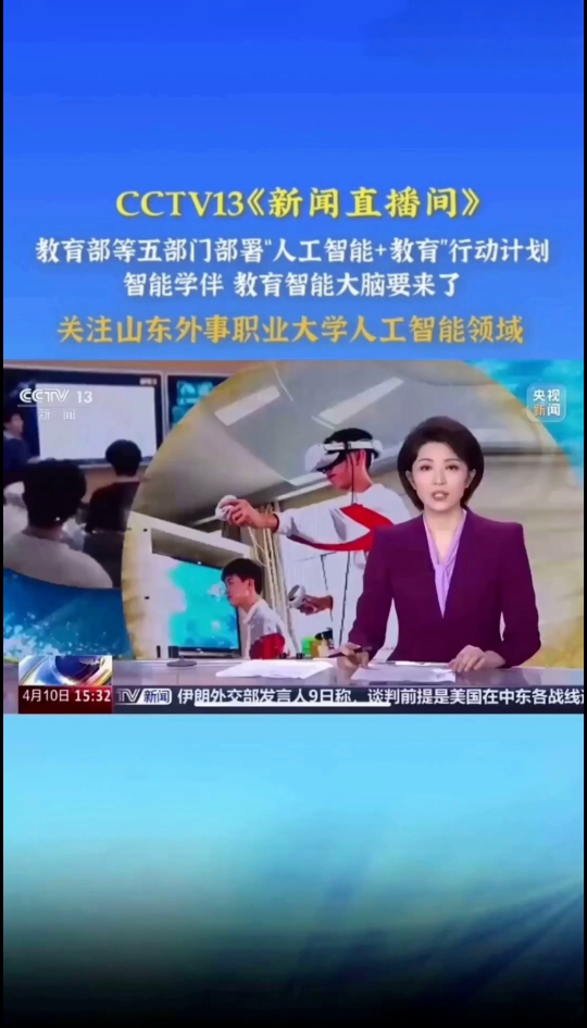 CCTV13《新闻直播间》播发《教育部等五部门部署“人工智能+教育”行动计划 智能学伴 教育智能大脑要来了》,关注山东外事职业大学人工智能领域